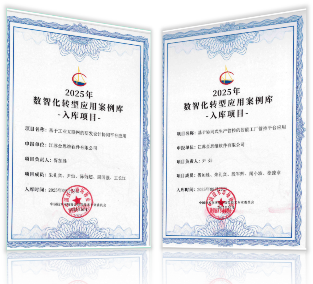 日前,中国技术市场协会发布2025数智化转型应用典型案例征集结果,金思维“基于工业互联网的研发设计协同平台应用”与“基于协同式生产管控的智能工厂管控平台应用”两案例成功入选。本次入选的两个案例,源自金思维为江南电缆与亨通力缆的多年服务实践,是经过用户企业深度应用并验证的智慧结晶。