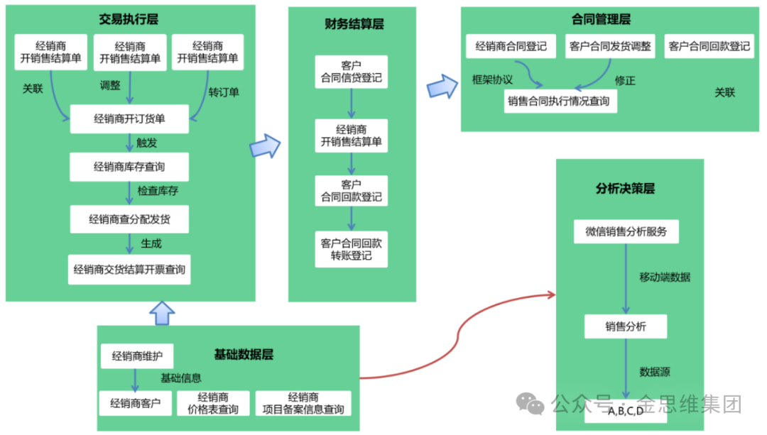 金思维经销商管理系统实现全流程透明化管理,经销商可自助查询库存、下单并实时跟踪订单进度及物流信息,厂商可灵活设置数据权限,有效优化库存周转并提升市场响应速度。