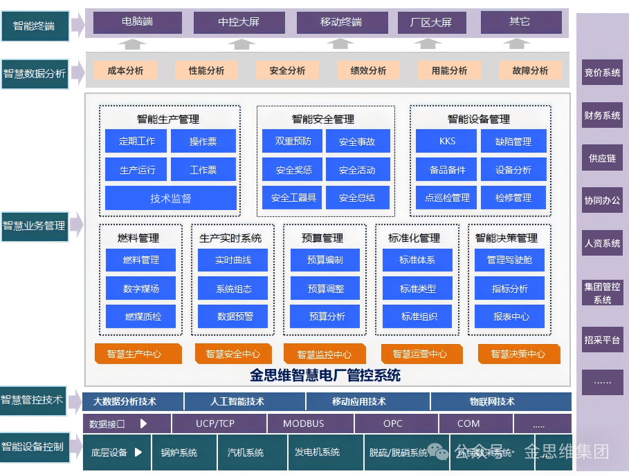 金思维智慧电厂管控系统是在长期的开发和应用实践中形成的,具备完整的发电企业信息化功能集,包括资产管理、生产管理、经营管理、指标管理、实时系统等,能够实现对发电企业全生命周期的管理。